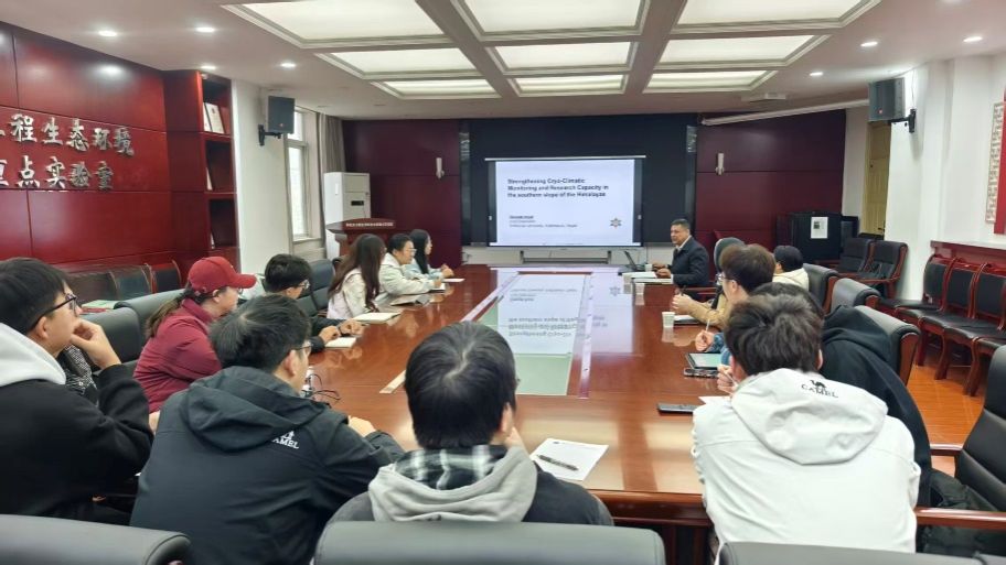 访问期间,迪帕克・阿亚尔在旱区水工程生态环境全国重点实验室作题为《加强喜马拉雅山脉南坡的冰冻气候监测与研究能力》的学术报告。报告中,他深入介绍了喜马拉雅南麓地区气候变化对水文与气象系统的影响,分享了该区域水文气象监测站点的建设布局及未来规划。水利水电学院20余人师生参加报告会,报告会由水利水电学院教授时鹏主持。