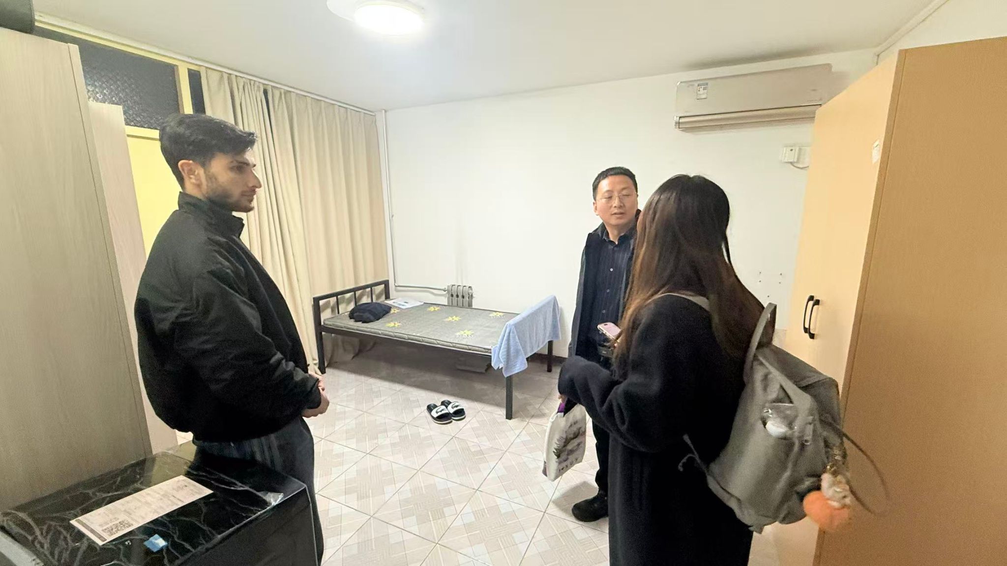 随后,虎琪赴国际学生宿舍实地检查水、电、消防等设施运行情况,现场排查安全隐患,并与留校国际学生亲切交流,了解其假期生活及学习情况。