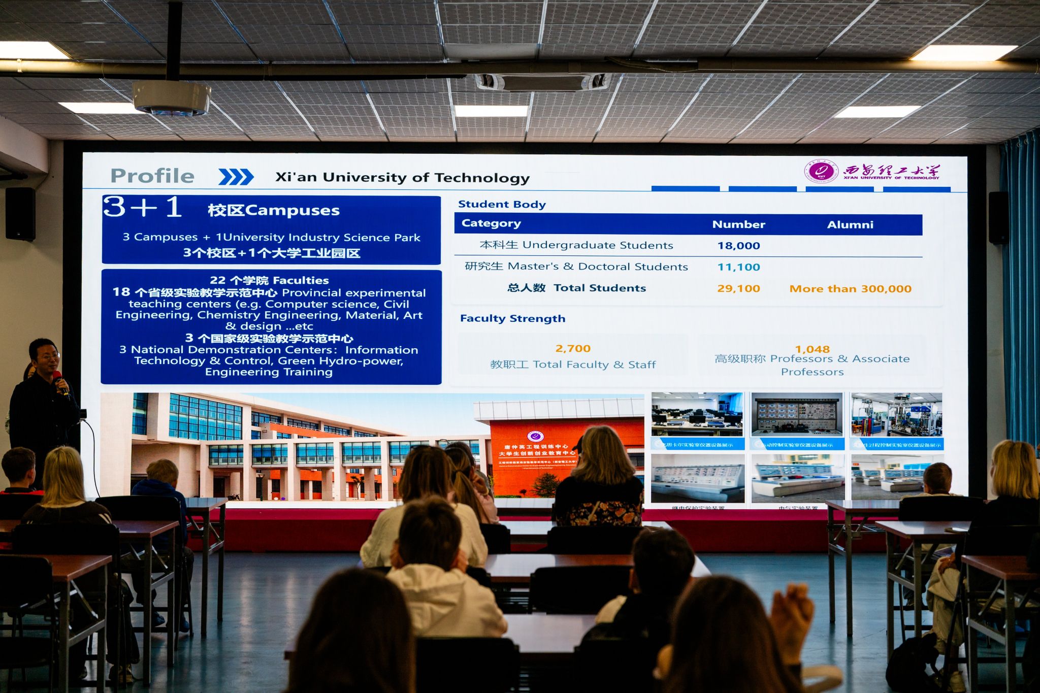 在曲江校区工程训练中心多功能报告厅,国际处副处长蒋小龙详细介绍了我校的办学特色、发展规模、国际合作等内容,重点解读了国际学生招生政策。俄罗斯师生及家长围绕招生流程、奖学金等问题积极提问,蒋小龙副处长逐一细致解答,现场气氛热烈融洽。