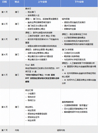 费用包含:课程费、审核行政费、境外保险费、7天6晚双人间住宿费、澳门期间部分大巴费用、场地费、参访交流费等。